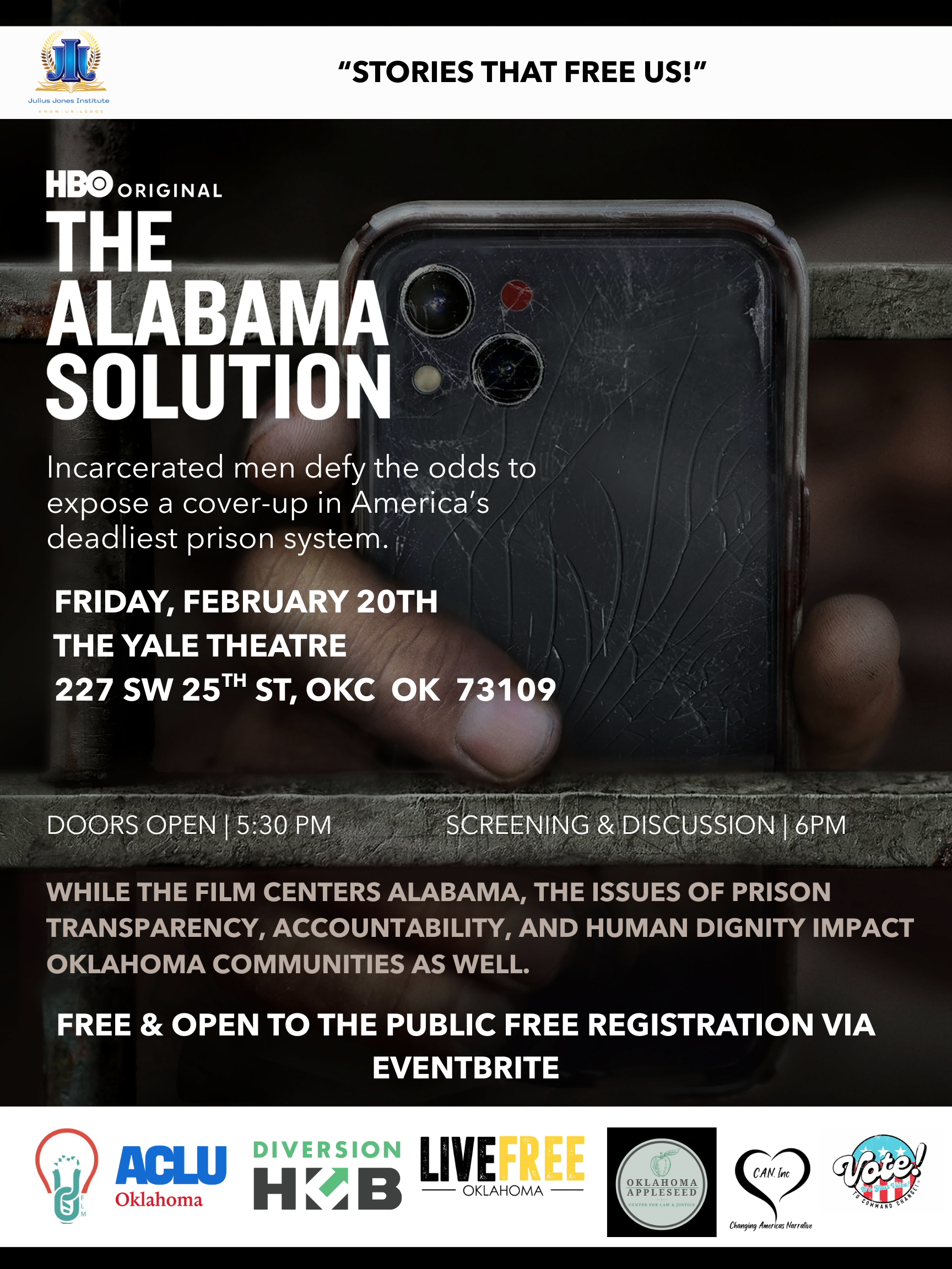 Join the Julius Jones Institute for a powerful community screening of The Alabama Solution, an Oscar-nominated 2025 documentary that brings audiences inside the Alabama Department of Corrections, revealing severe conditions, unchecked violence, and systemic failures long hidden from public view through footage recorded by incarcerated people themselves.